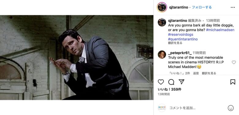 タランティーノ監督はInstagramに『レザボア・ドッグス』のマドセンの写真をアップし、ミスター・ブロンドのセリフ「1日中吠え続けるのか、子犬ちゃん。それとも噛みつくか?(Are you gonna bark all day little doggie, or are you gonna bite?)」と添えた。