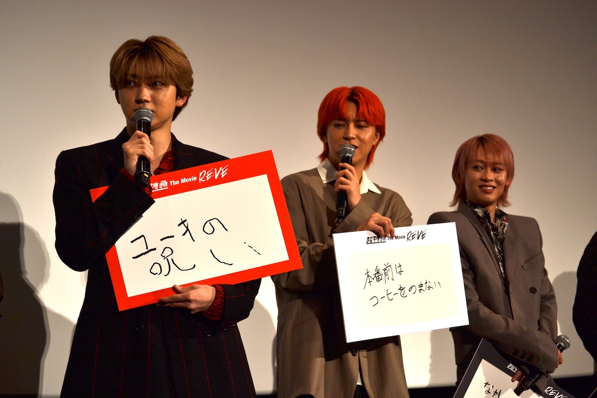 司会者が映画が制作されると聞いたときの印象と作品の感想を聞くと、リーダーのリョウガは「僕たちみたいなふざけたグループをどうやって映画化するんだろうって思ったんですが、こんな最高の作品になるんだって驚きました」とコメント。ユーキは「ライブの感動となかなか見られないライブを作るまでの過程を目に焼き付けてもらいたい。あと応援上映ではコールもペンライトもできるので、どんちゃん騒ぎしてくれると嬉しいです」と答え、ハルは「僕らの思いがこもった超特急らしさを全面に出した映画なので、見ていて楽しかったです」とにっこり。