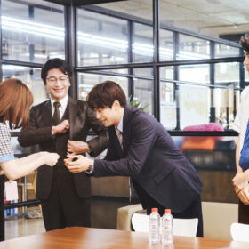 2つ目は、ソウタと一緒にバンコクに赴任してきた先輩社員のジン(及川光博)が、通訳のルーク(逢見亮太)を介してバンコクのオフィスで挨拶を交わすシーン。