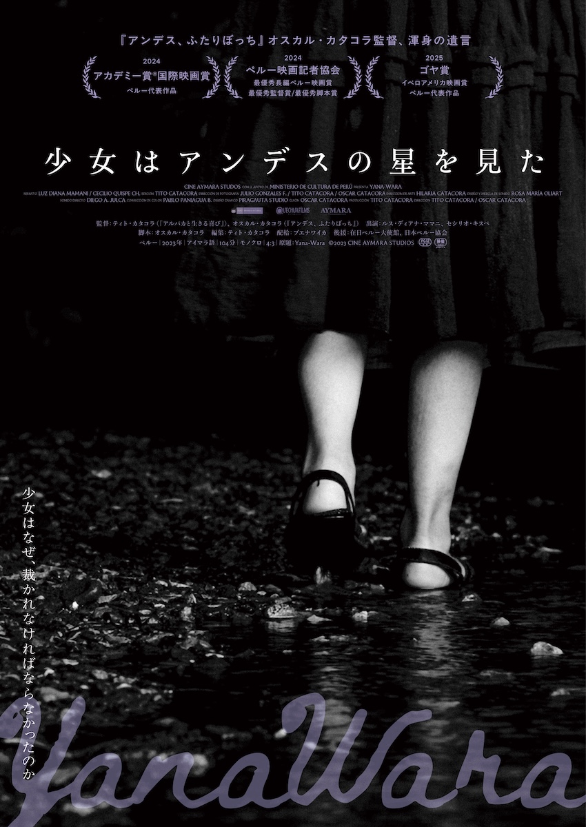 今回紹介する3点のアザービジュアルは、本編から少女ヤナワラの運命を示唆する印象的な場面からピックアップしたもの。ペルーの先住民の女性たちが身につける山高帽風の帽子とマントを羽織った後ろ姿、水辺を踏み締める足、手を重ね合わせ横たわる姿とヤナワラに待ち受ける過酷な運命を感じさせるものとなっている。